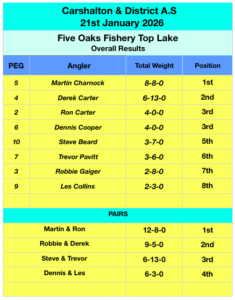 The first midweek match of 2026 saw the Coffin Dodgers crew attend what was to be a difficult day at Five Oaks Fishery. Whilst there were plenty of small fish to accept a bait the quality fish were much harder to tempt with Steve Beard on peg 10 catching a few better stamp skimmers however for the rest of the field it was more of a small fish race. Martin Charnock excels at catching miniature fish at speed taking in excess of 500 blips as he took the spoils with 8-8-0 along with his winning pairs partner Ron Carter on peg 2 who added 4-0-0 to their total for 12-8-0 to win the random pairs pool. Second place from peg 4 was Derek Carter (top Right) with 6-13-0. Dennis Cooper on peg 6 took joint third with Ron with a weight of 4-0-0 from peg 6.