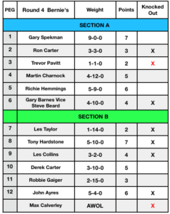 Round 4 turned out to be another tricky day. Feed to much or at the wrong time and the Carp would muscle in to upset what was already a challenge in getting bites from the Silvers. The added influx of water created by this weeks rain didn’t really help matters either. Top bloke was Gary Spackman on end peg 1 with 9-0-0 of quality skimmers in second place was Tony Hardstone with 5-10-0 just piping Richie Hemmings by one ounce to place him in third place, with John Ayres taking fourth place with 5-4-0. Two more individuals were knocked out today those being Trevor Pavitt & Max Calverley. The remaining five anglers going into the next round at Sumners are Richie Hemmings, Gary Spackman, Derek Carter, Martin Charnock & Robbie Gaiger where by only three of the five will go through to the final round held on Harris Lake at Marsh Farm Fishery.