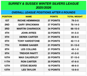 The final round of the CADAS Surrey & Sussex Winter silvers League was held at Godalmings Marsh Farm Complex on Harris Lake. Renowned for it’s big Crucians as well as some big Tench which could see a big shake up for the league positions especially for those in the top six placings of the league. Also it was the final Individual knock-out whereby it was the same three anglers from the last series that would see only the top two highest weights take the spoils. Wind plays a big factor on this lake and today was no exception as the top three weights came from the far end pegs. John Ayres was pegged on the second to last peg 27 taking the match by storm with a cracking net of Tench on red maggot for the win with 32-2-0. This win shot him into fourth place in the final league standings. Ron carter end peg 26 took second place with 16-10-0 and Robbie Gaiger from peg 29 with 11-5-0 taking third place. As for the league it came down to the wire with Richie Hemmings just holding onto the series win by a weight of just 5 ounces over the course of the six rounds as both Gary Spackman tied on points with 37 points. Martin Charnock took third place overall with a total of 34 points. As for the Individual knockout Gary Spackman became the Champion landing 8-10-0 to runner up Martin Charnock’s 7-12-0, Derek Carter was third with just 1-2-0 picking up sweet FA.