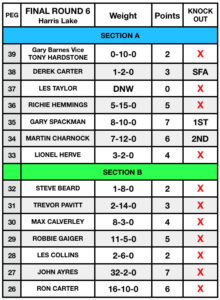 The penultimate Round 5 saw the venue at Sumners Match lake. Whilst being a Silvers event there were lots of Carp that would cause issues amongst the competitors as unwanted hooked Carp had the potential of ruining the swim for a few valued minutes taking time to land and spooking the Silvers in the peg. It was also the Semi-final of the Individual Knockout with only three from the remaining five anglers going through to the final round at Marsh Farm. Those that qualified were Martin Charnock, Derek Carter & Gary Spackman the same anglers from last year making the final three. John Ayres top left took the win today with 20-13-0 from peg 3, in second place was Martin Charnock catching 637 fish for 18-8-0 with third place going to Derek Carter top center from peg 4 weighing 15-15-0 and in section B Gary Spackman top right took fourth with 15-3-0.